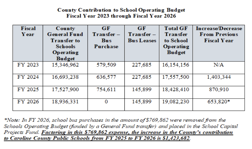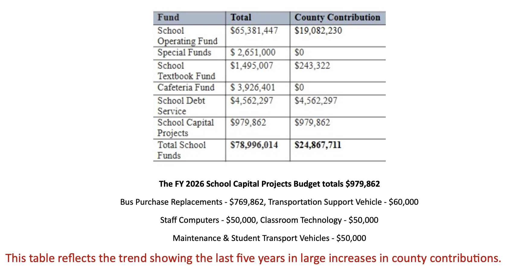 Of special note is that just over 30 per cent of our annual overall county budget is now devoted to schools. The FY 2026 budget for Operations for the schools was $65,381,447. The states contribution for schools was $44,545, 881 and this year, the county contribution was 19,082,230 which is $1,423,682 more than last year. The first table shows a breakdown of school funding for this year.