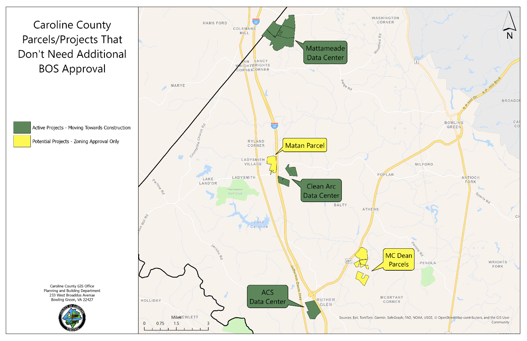 There are currently three (3) data centers in the County that have zoning approval, power allocated by Dominion Energy, and are either underway or have indicated their intention to begin construction as soon as possible. These three (3) projects are: